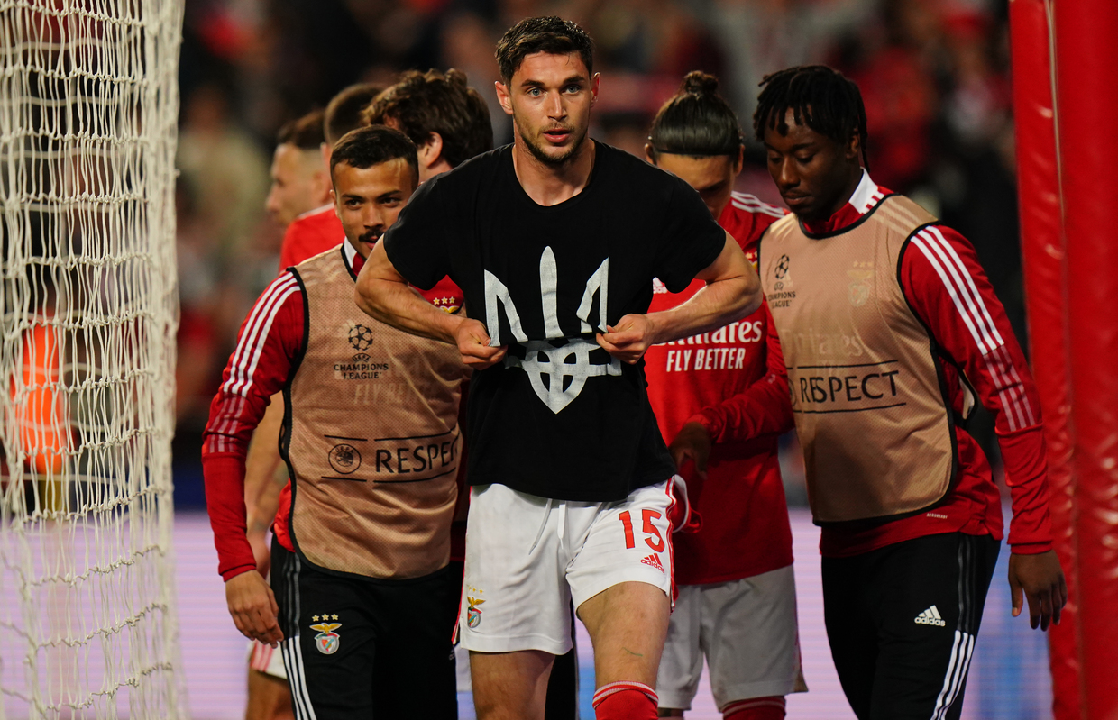 The forward celebrated by removing his jersey to reveal a black T-shirt bearing a Ukrainian ‘trident’ symbol.