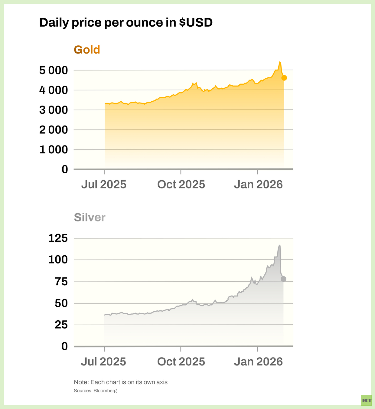 Gold prices plunged 8% to $4,465 an ounce on Monday, breaking a streak of record highs that had briefly pushed the metal to nearly $5,600 last week, before a partial rebound. Silver dropped 7%, following a 30% slide on Friday.