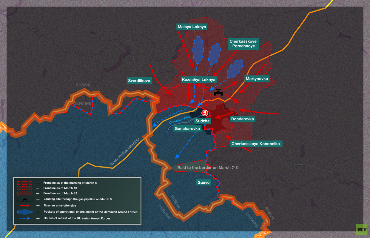 On the morning of March 8, the now-famous operation where Russian troops crawled through a gas pipeline to infiltrate the industrial zone of Sudzha took place. 800 troops (essentially a regiment) successfully disrupted enemy logistics, and by the end of the day, the area to the north and east of the exit point was liberated from Ukrainian control.