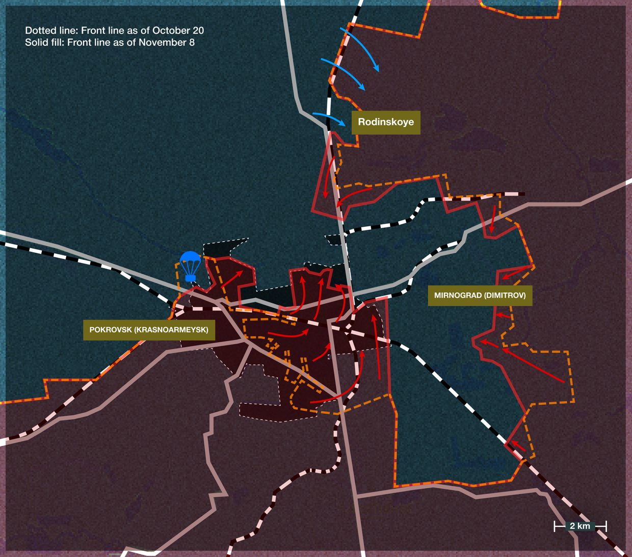 By September, Mirnograd, along with the fields, mines, and worker settlements surrounding it, was operationally encircled, and by the end of October, it was surrounded. Much of Pokrovsk was also captured at this time.