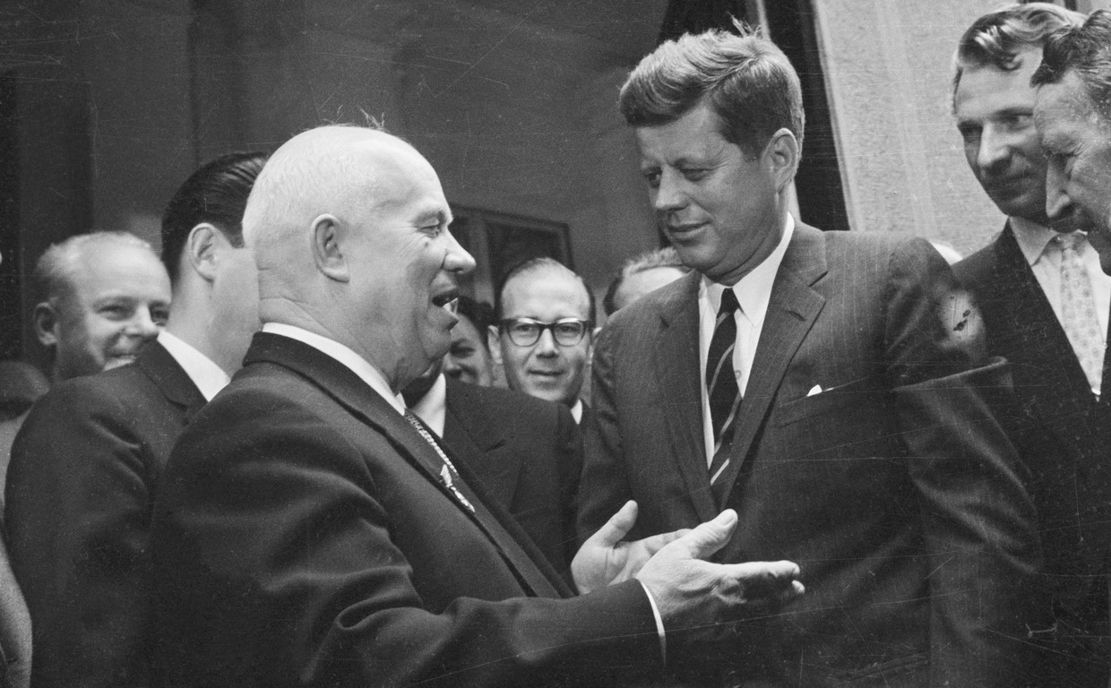 John Kennedy and Nikita Khrushchev chat outside the Soviet Embassy in Vienna following their summit meeting. June 04, 1961.