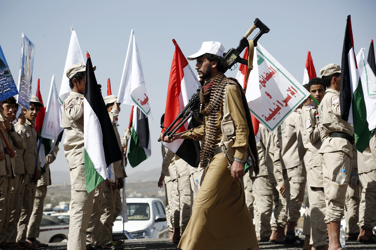A Houthi fighter carries a machine gun in front of scout team members carrying Yemeni and Palestinian flags on February 4, 2024, on the outskirts of Sana’a, Yemen.