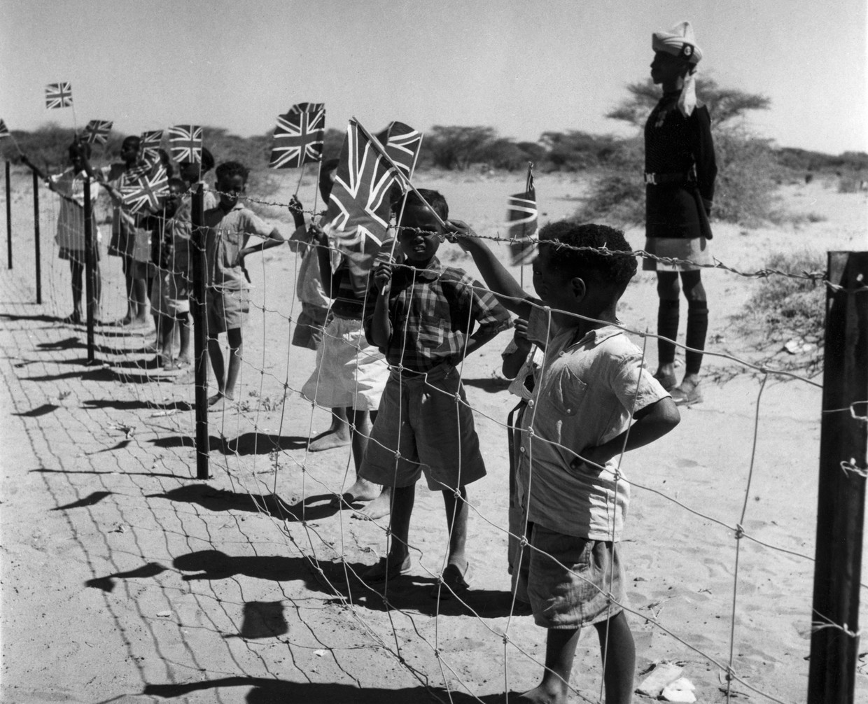 Children holding British flags as the Duke and Duchess of Gloucester pass through Somalia, circa 1960.