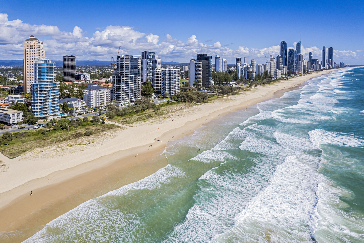 An aerial view of Australia’s Gold Coast looking north to Surfers Paradise.